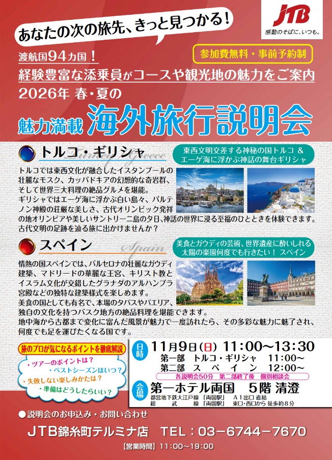 ご希望のお客様はJTB錦糸町テルミナ店までお問い合わせください。