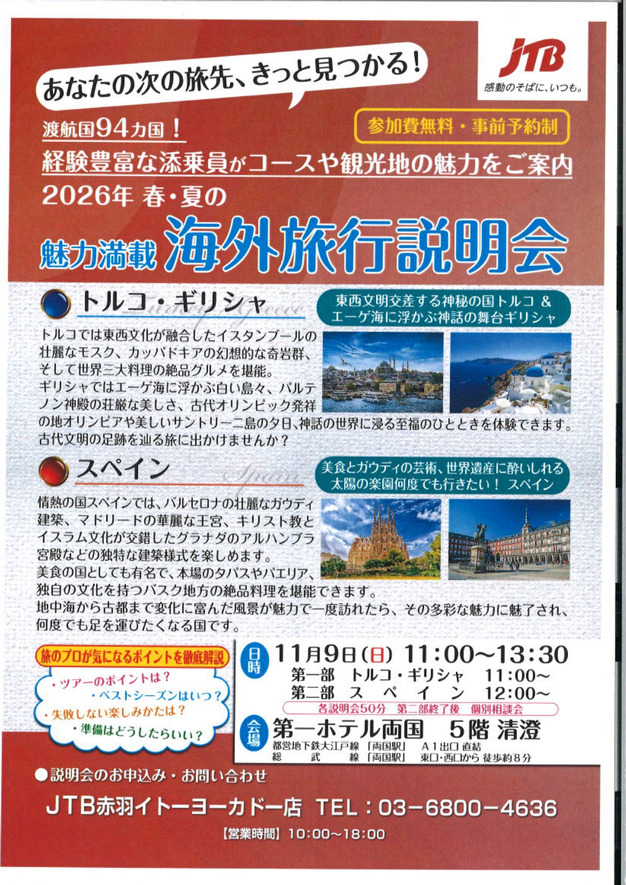 ご不明点などございましたらJTB赤羽イトーヨーカドー店までお問合せくださいませ。