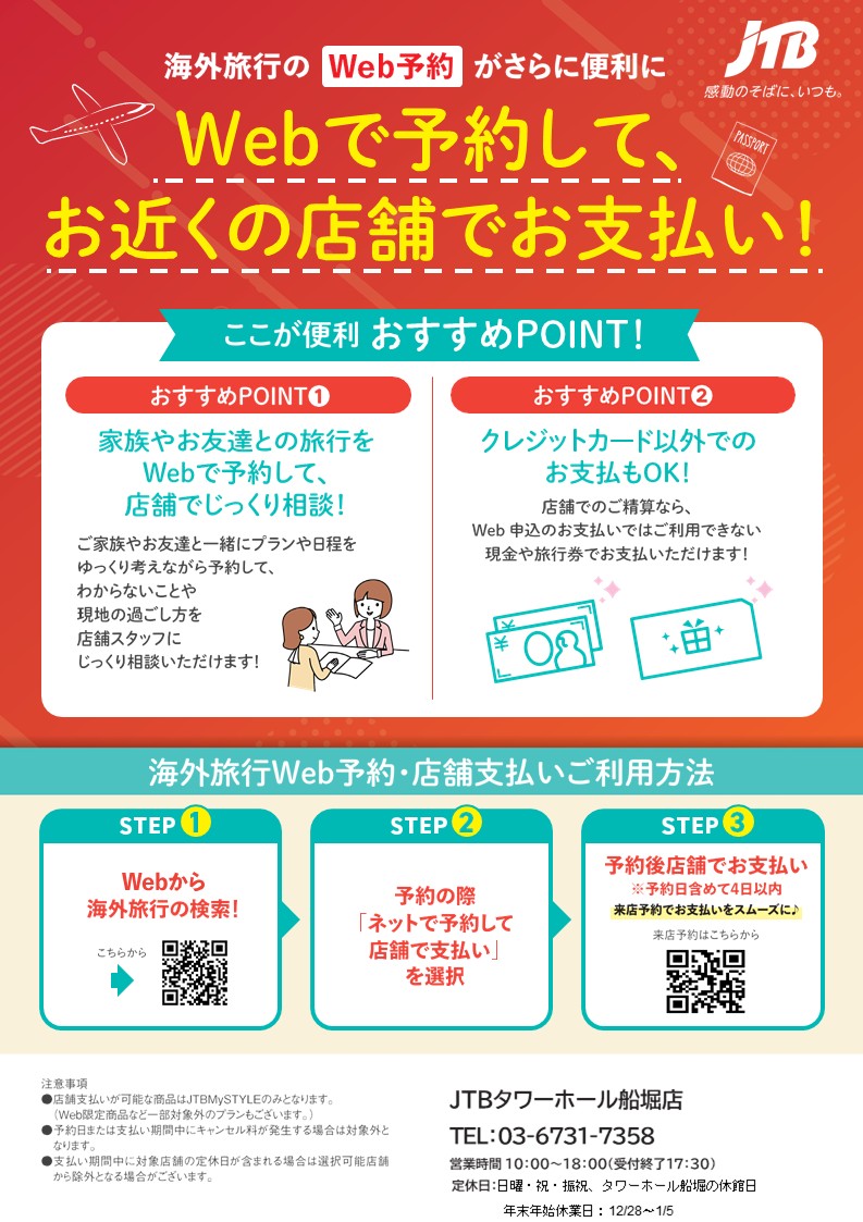 最寄りのJTB店舗で旅の相談&お支払いをすることができますよ。(*)