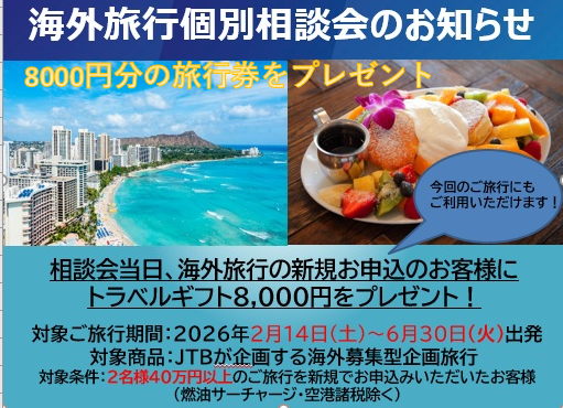 事前にご予約の上ご来店いただき、海外旅行を新規でお申し込みいただくと、旅行代金から5,000円を割引いたします!