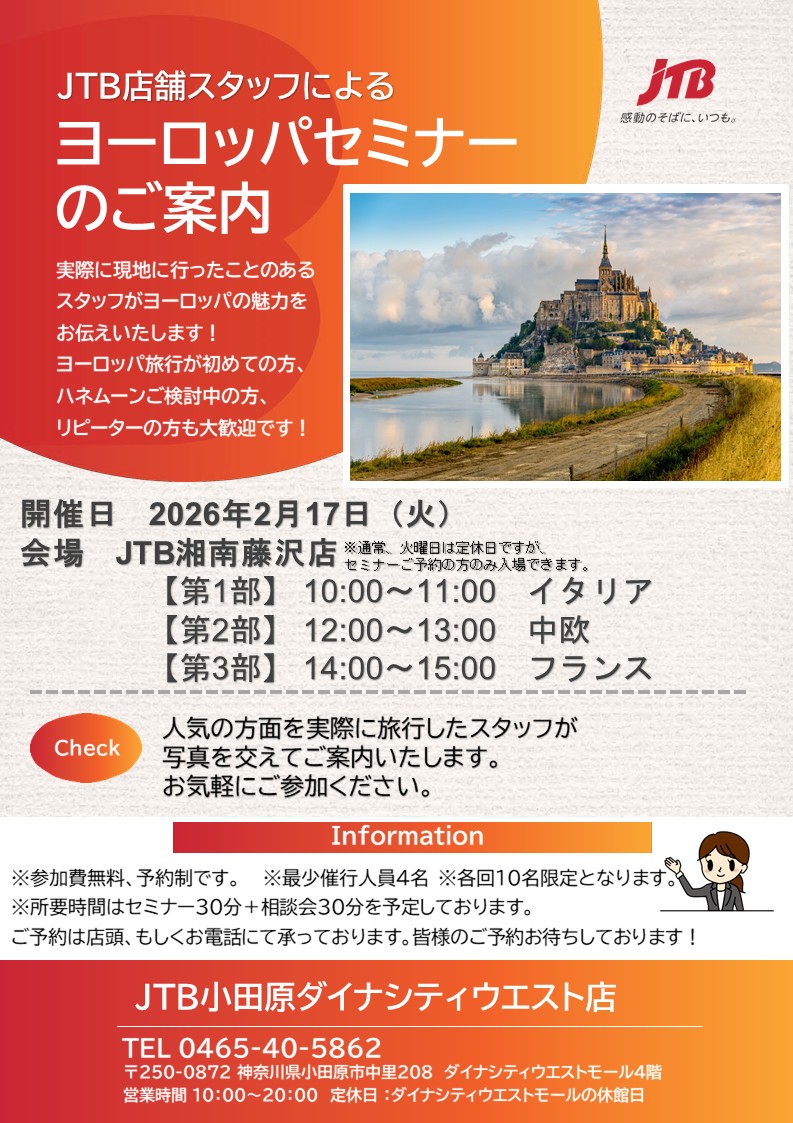 📞 JTB小田原ダイナシティウエスト店 TEL:0465-40-5862