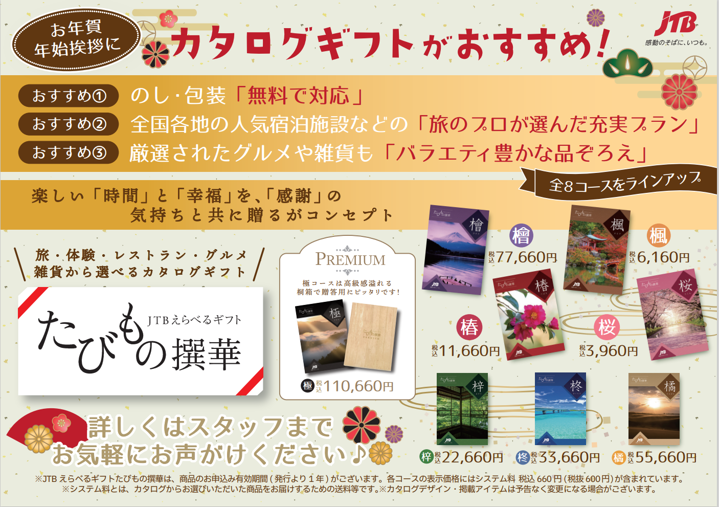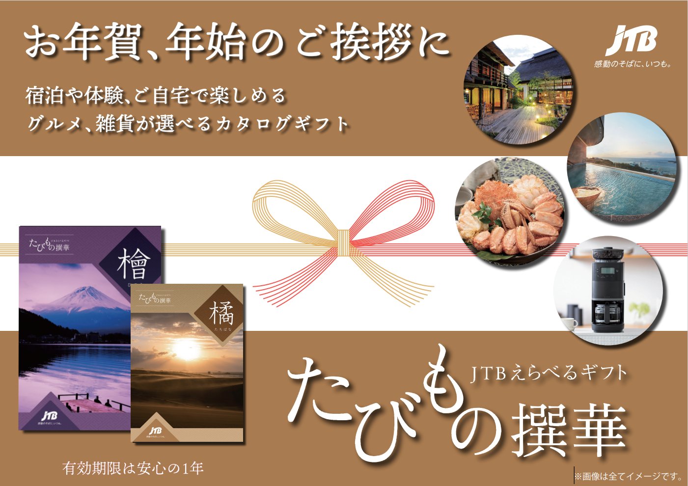 全国の名旅館・ホテルの宿泊プラン、世界の雑貨やグルメ、日本の伝統工芸品など、JTBらしい幅広いジャンルが特徴で、贈り物や返礼に最適です。