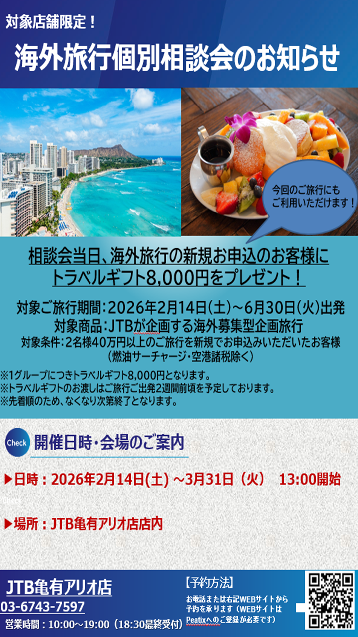 対象店舗:首都圏エリア(東京都・千葉県・神奈川県・山梨県)のJTB対象店舗にてお申込み