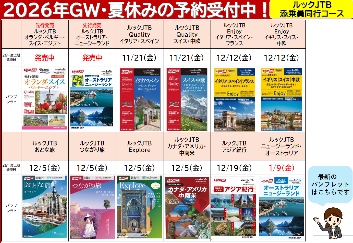 2026年4〜10月ご出発の添乗員付きツアーが、10/17より順次発売開始しております。