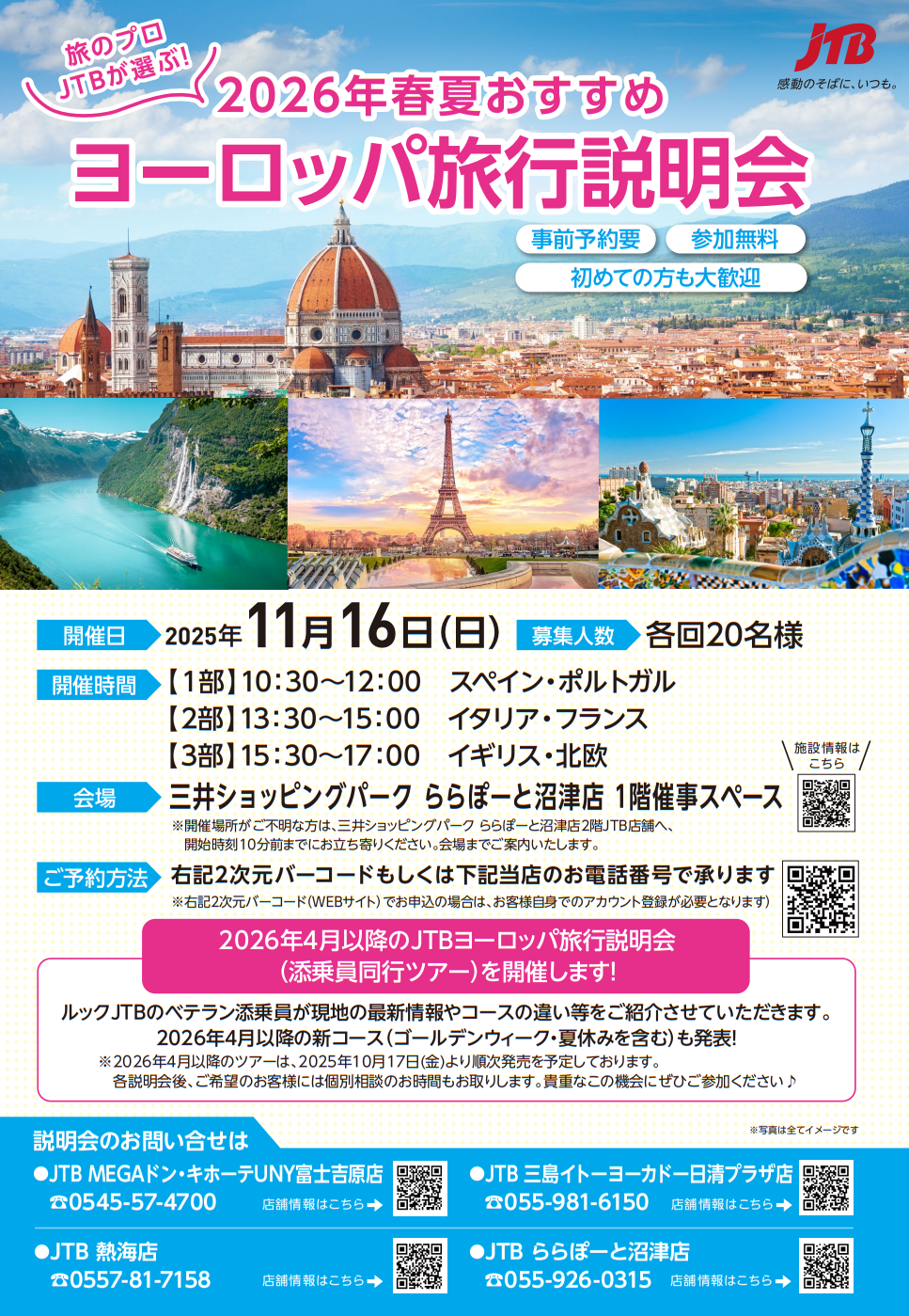 JTB人気パッケージ「ルックJTB」ならではの旬の「スイス」をはじめ、「スペイン」「イタリア」と人気の旅先をご案内します!