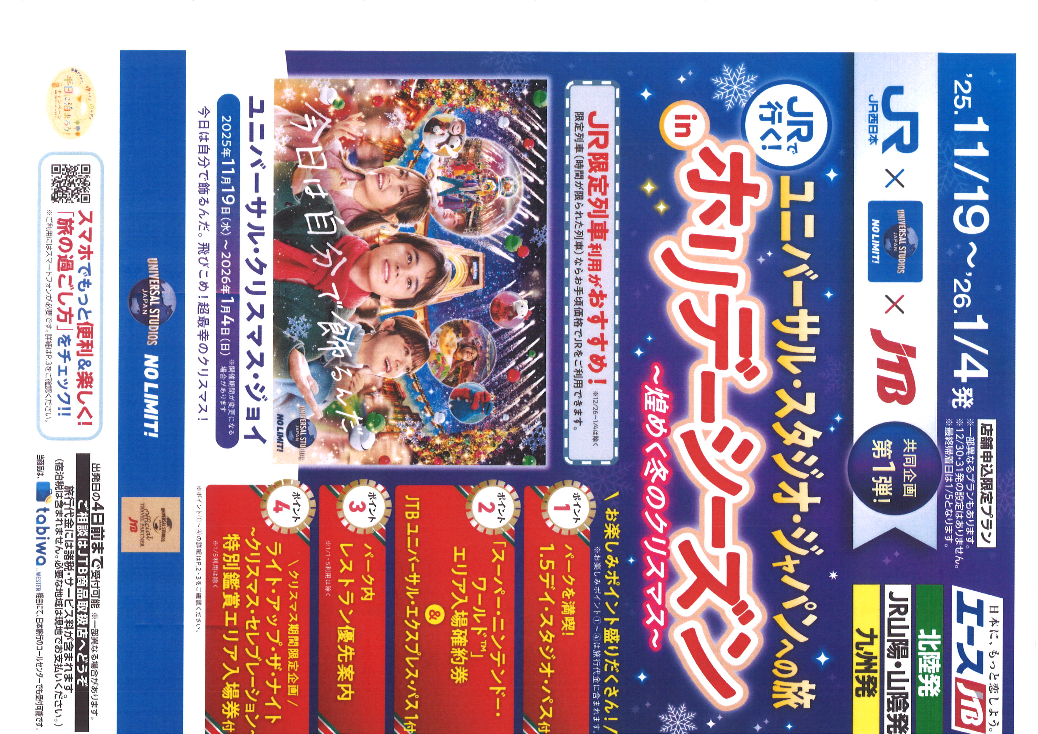 パークをたっぷり楽しめる「1.5 デイ・スタジオ・パス」や、JTB ユニバーサル・エクスプ レス・パス 1&「スーパー・ニンテンドー・ワールド™」 エリア入場確約券付。さらに、 人気レストランの優先案内や、クリスマス期間限定のスペシャル・ショーを特別鑑賞エリアでご覧いただける入場券などこのシーズンを存分にお楽しみいただける内容となっております。設定期間は 11/19~1/4 出発、JR セット限定のプランです。