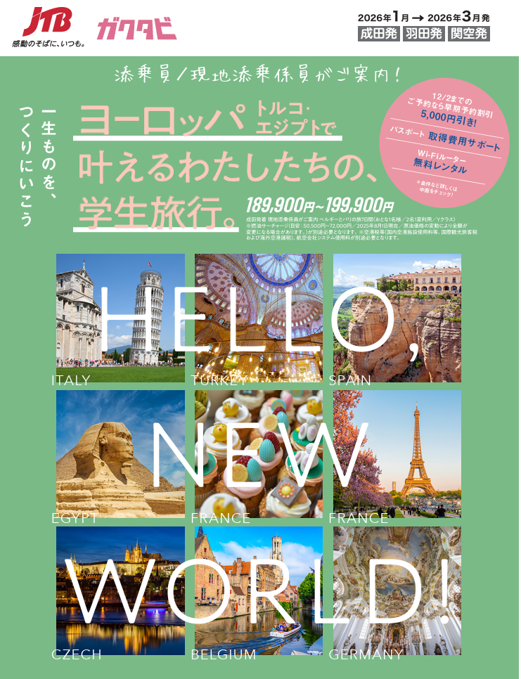 海外旅行も国内旅行もたっぷり充実!はじめての海外旅行や学生旅行に嬉しいポイントがもりだくさん!あまり旅行に慣れていない方でも、サポート充実のJTBなら安心です。