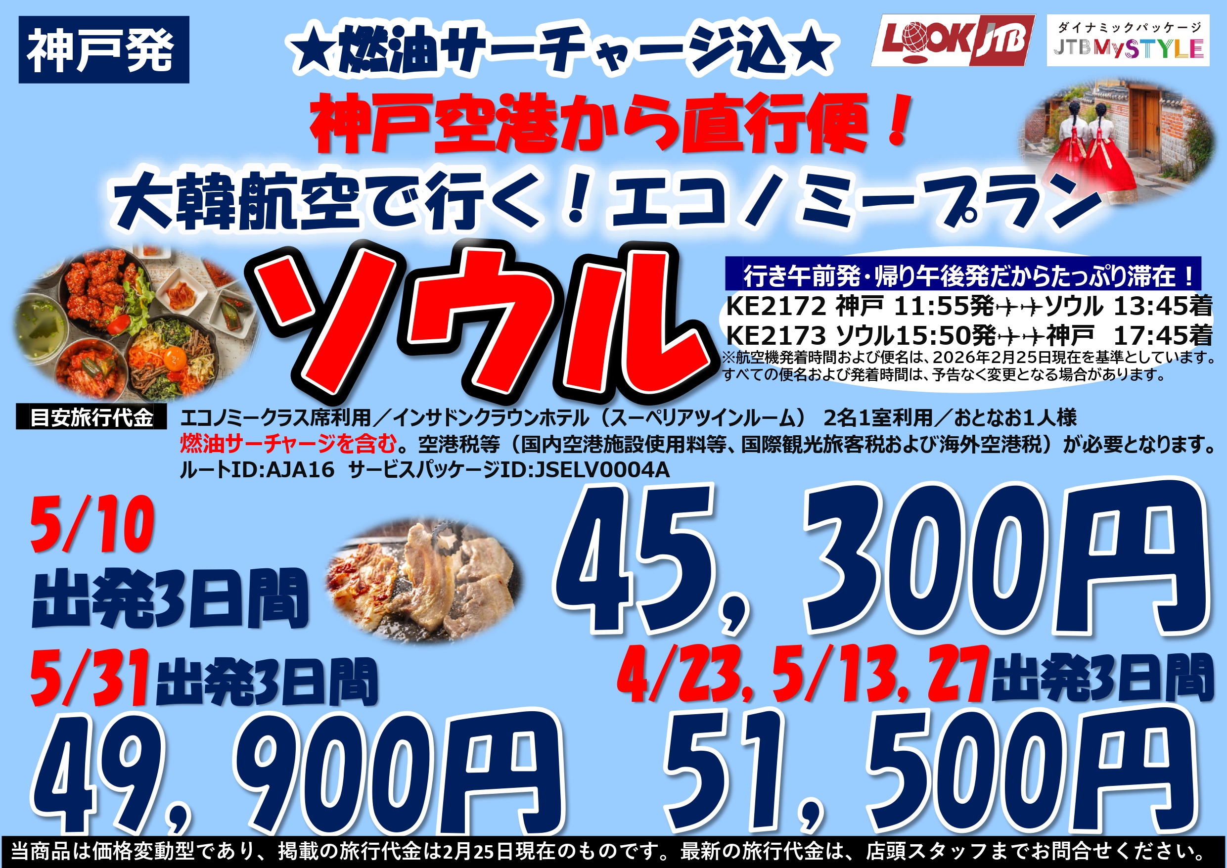 旅行代金は3日間でひとり45,300円から!燃油サーチャージも込みです!