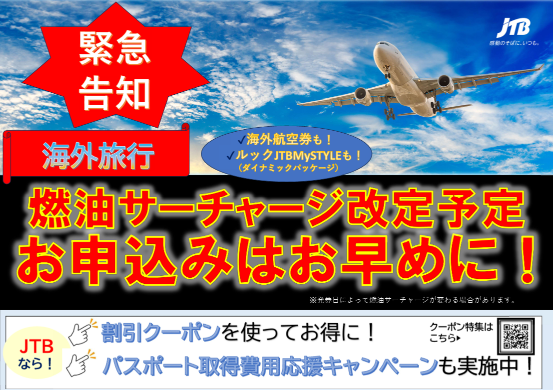 【添乗員同行ツアー】につきましては、ご出発の1ヶ月前に燃油サーチャージが確定するため、お申込みのタイミングでお得になる、ということはございませんが、添乗員のつなかい【個人旅行】の場合は、お申込みのタイミングで燃油サーチャージが変わってきますので、お早めのご予約をおすすめいたします!