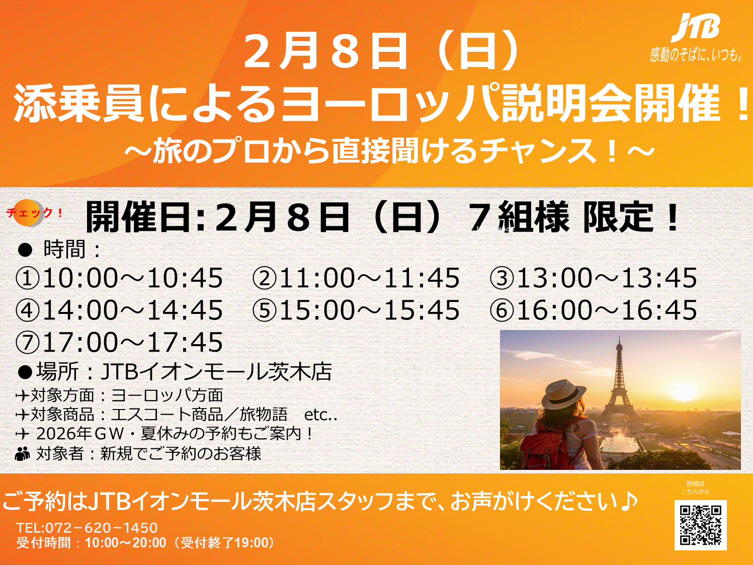 気になった方は、JTBイオンモール茨木店まで、お気軽にお問合せ下さい。