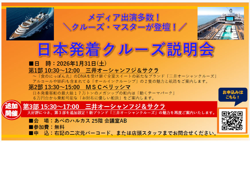 【第2部】 13:30~15:00 MSCベリッシマ⇒残り僅か!