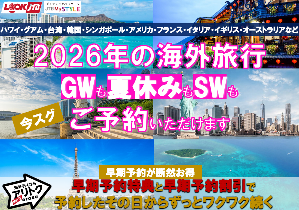 海外旅行も国内旅行もたっぷり充実!はじめての海外旅行や学生旅行に嬉しいポイントがもりだくさん!あまり旅行に慣れていない方でも、サポート充実のJTBなら安心です。