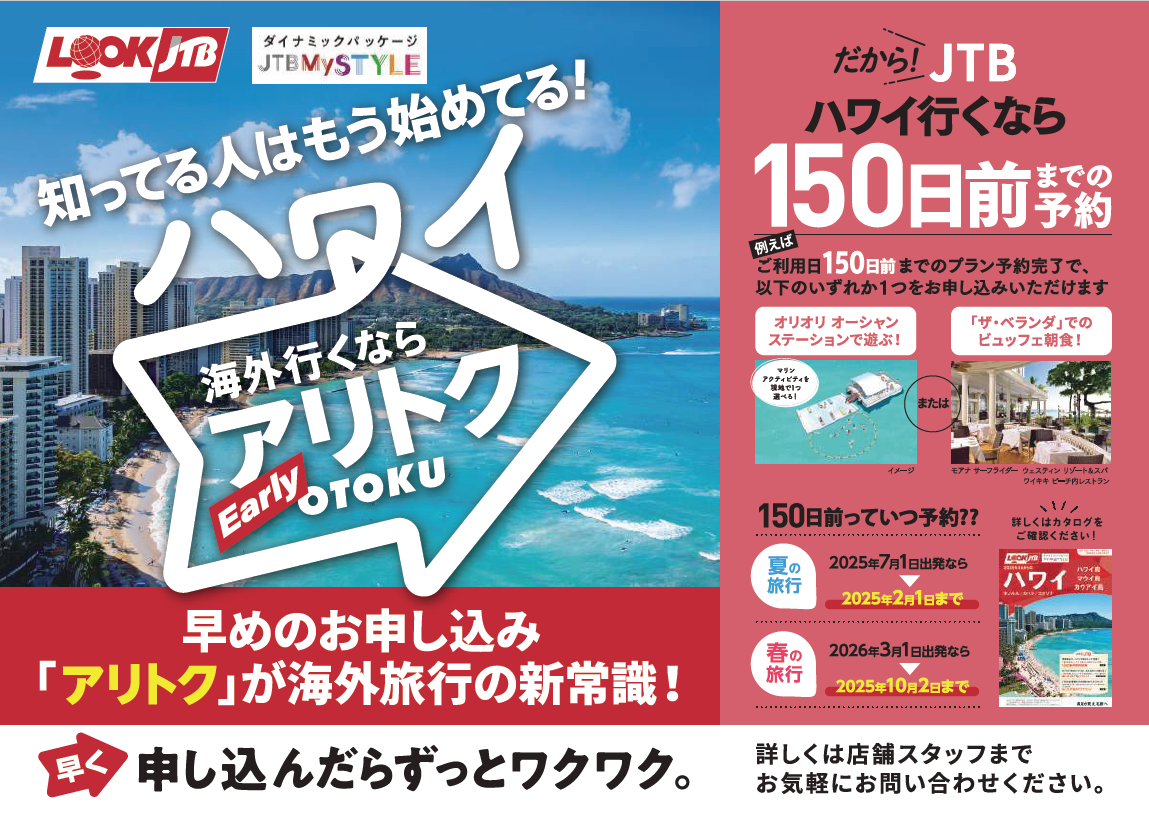 150日前までの予約で以下のいずれか1つ追加代金なしで申込可能!
