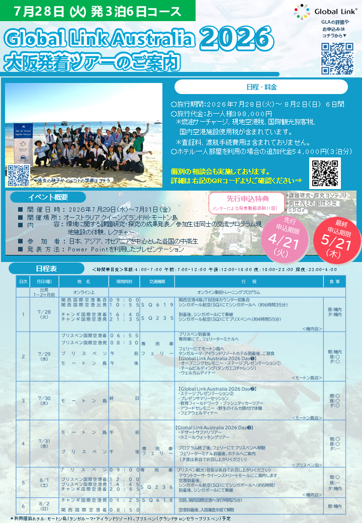 『環境』をテーマに課題研究・探究に取り組む小中高生が集まる3日間の国際教育イベント。それが【Global Link Australia2026】です!