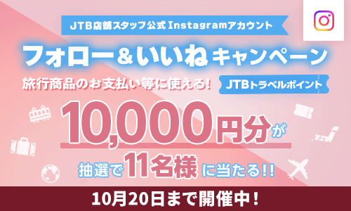 抽選で、旅行商品のお支払い等に使える『JTBトラベルポイント10,000円分』が当たります!