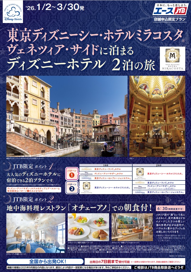 現在「東京ディズニーシー・ホテルミラコスタ®ヴェネツィア・サイドに泊まるディズニーホテル2泊の旅」が好評発売中です。