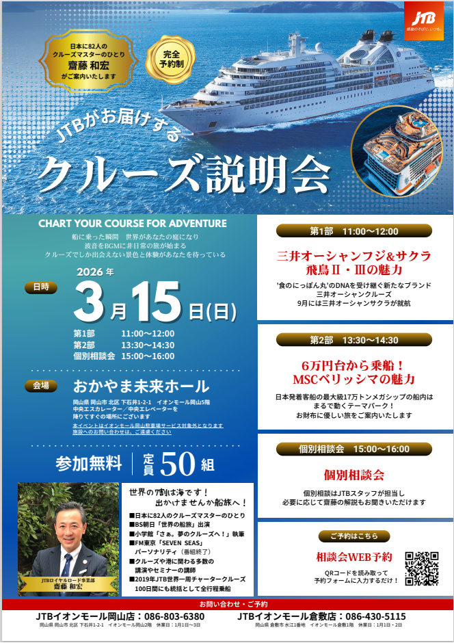 (説明会終了後、JTBスタッフによる個別相談会を開催します。必要に応じて、クルーズマスター齋藤の解説もお聞きいただけます)