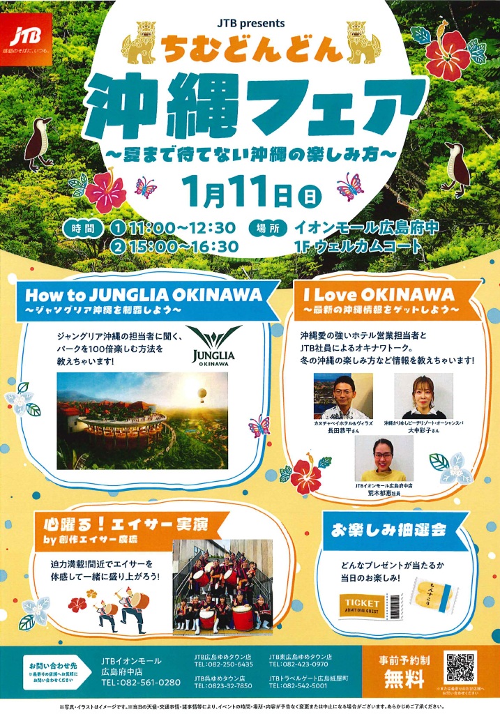 今話題のジャングリア沖縄を満喫する方法や沖縄愛が強めのホテル営業担当者とJTB社員によるオキナワ🌺トーク、迫力満載のエイサーの実演、お楽しみ抽選会など盛りだくさんのイベントです。
