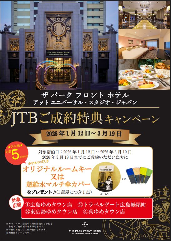 JTB ユニバーサル・エクスプレス・パス 1&「スーパー・ニンテンドー・ワールド™」 エリア入場確約券や、楽しかった思い出を持ち帰れるライド・フォト引換券(1部屋1枚)、 さらに、おなじみのアイテム・1UPキノコのドリンクボトル引換券(1人1つ)がつく存分にパークを楽しめる春限定のプランです。