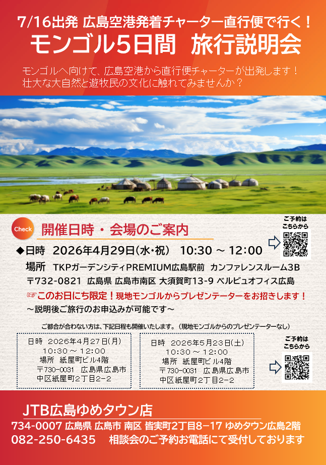 モンゴルへ向けて、広島空港から直行便チャーターが出発します!