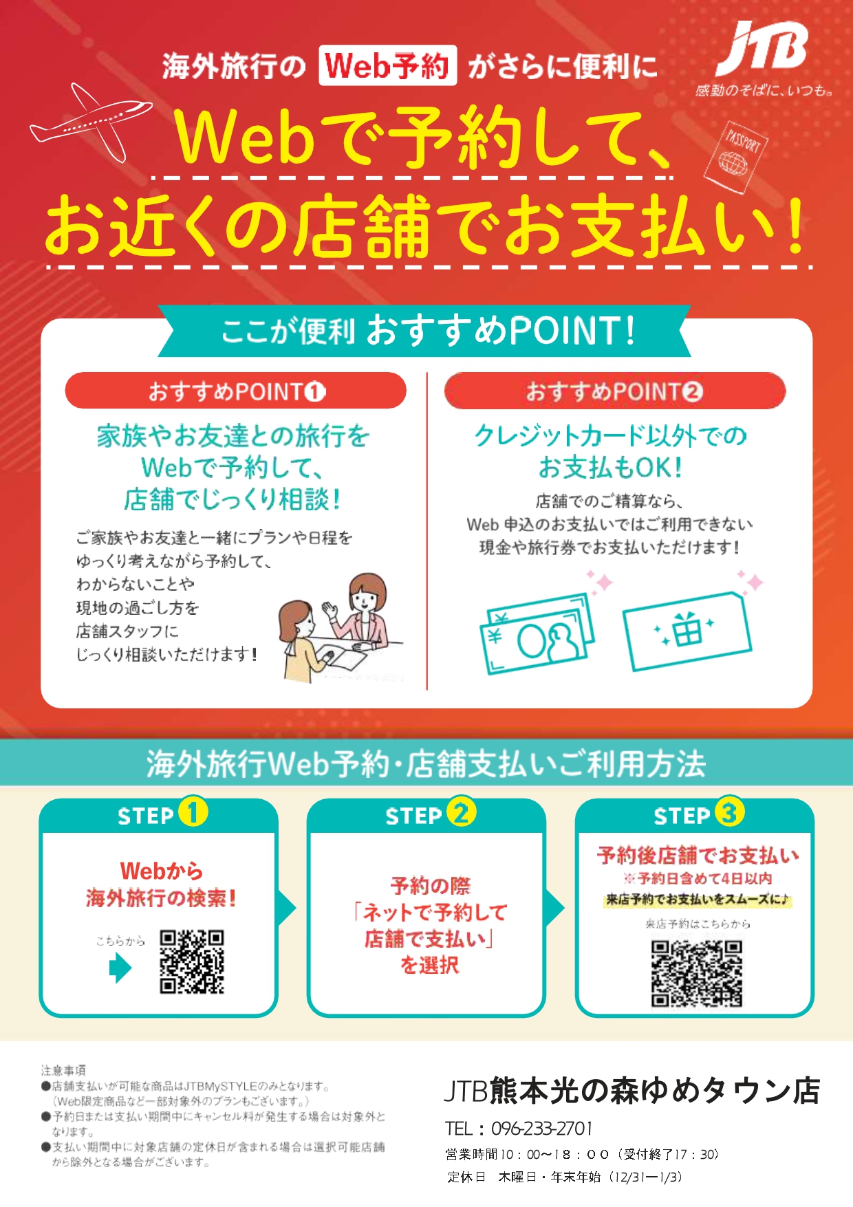 最寄りのJTB店舗で旅の相談&お支払いをすることができますよ。(*)