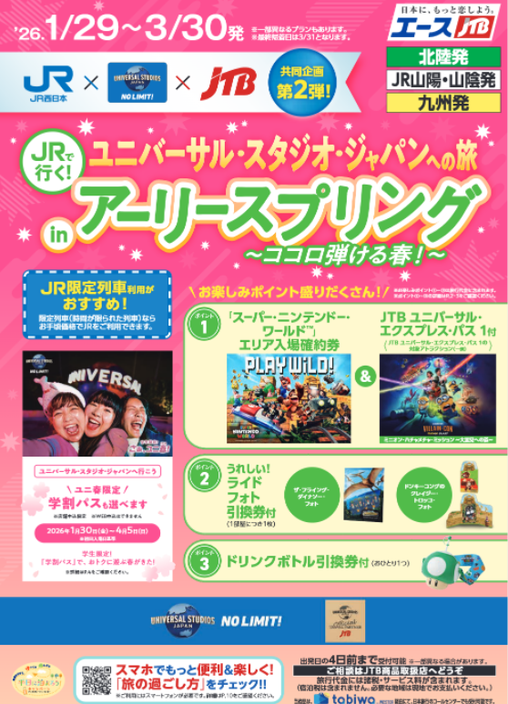 さらに学生の皆様へ朗報!設定期間中は、ユニバーサル・スタジオ・ジャパンの学生応援キャンペーン「ユニ春(ユニバル)」を開催中。学生限定の学割パスでおトクに春を満喫し、忘れられない思い出を作りましょう!