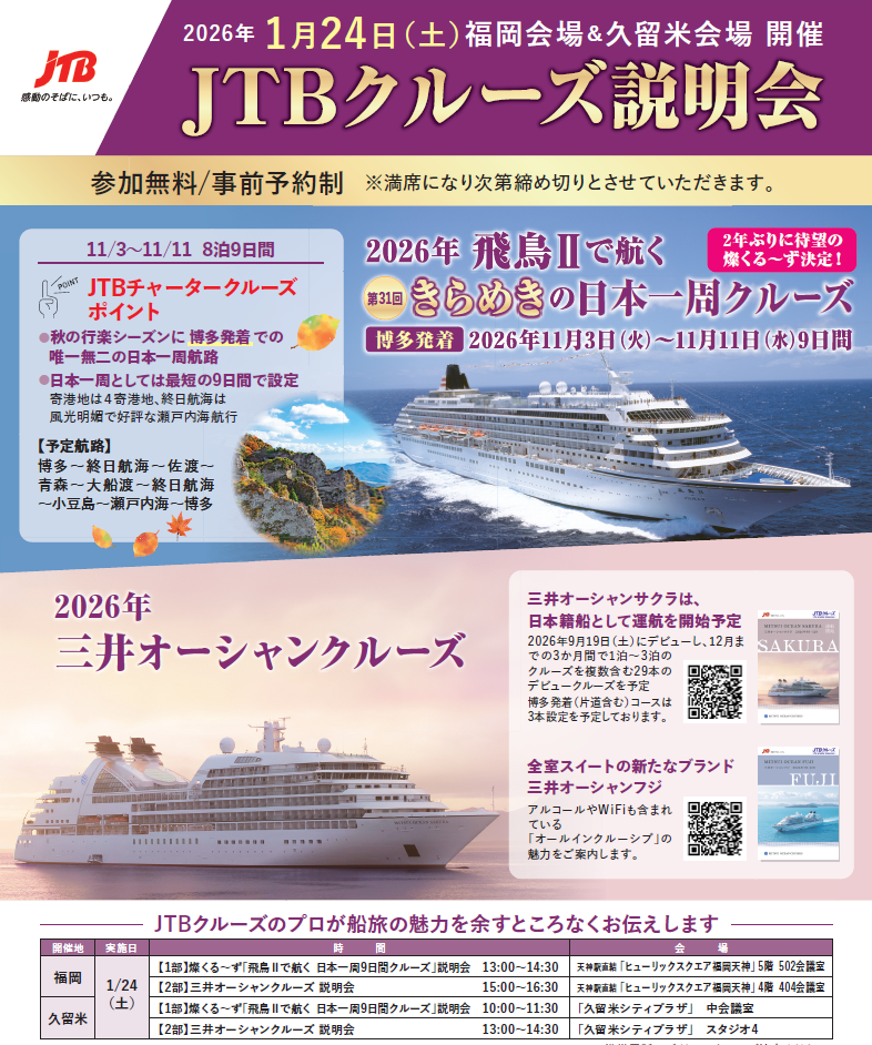 【1部】燦くる~ず「飛鳥Ⅱで航く 日本1周9日間クルーズ」説明会 10:00~11:30 久留米シティプラザ 中会議室