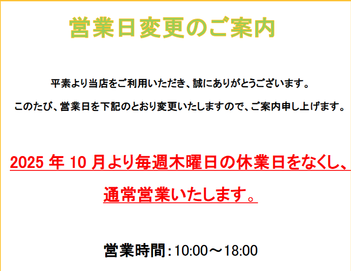 10月より:定休日無し(年末年始、ゆめタウンの休業日を除く)
